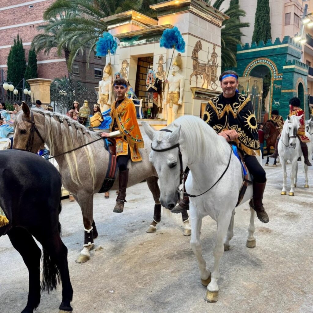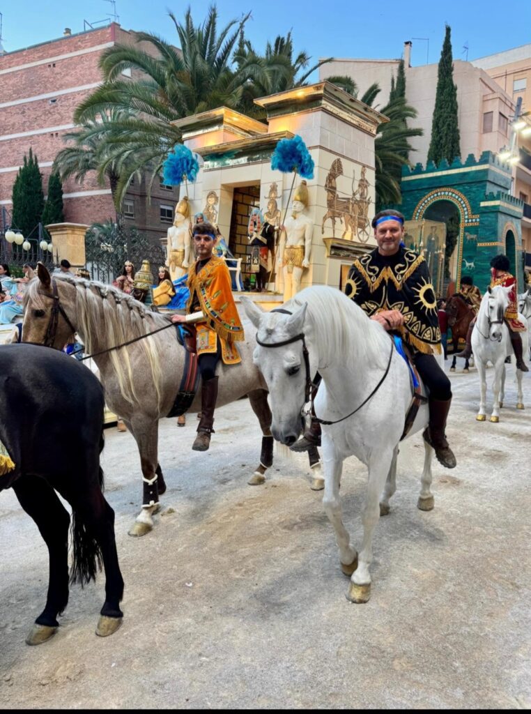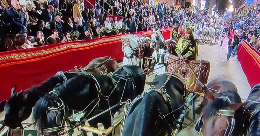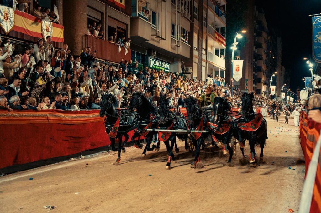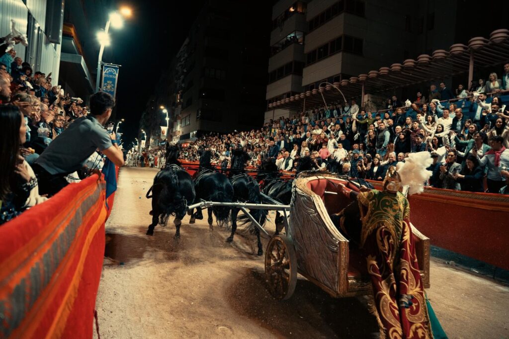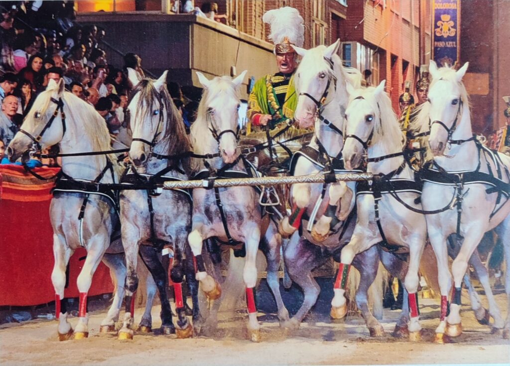 Nos explica también una curiosidad histórica: en la época romana se usaban las bigas (de dos caballos) y las cuadrigas (de cuatro) para las entradas triunfales, pero lo de las sigas de seis caballos es algo único de Lorca. Además, sus caballos van sin anteojeras, igual que iban los de los carros romanos originales. Esto hace que el mérito sea mayor, porque el animal lo ve todo y tiene que confiar plenamente en la mano del auriga.