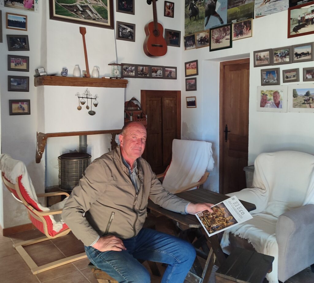 Nos recibe en su cortijo, bautizado también como “El Sordo”. Las paredes de la estancia son un testamento de su vida: están forradas de fotografías de carros de Semana Santa, enganches, caballos espectaculares, escenas de toros y trofeos. Como él mismo confiesa, le apasiona todo lo relacionado con el campo.