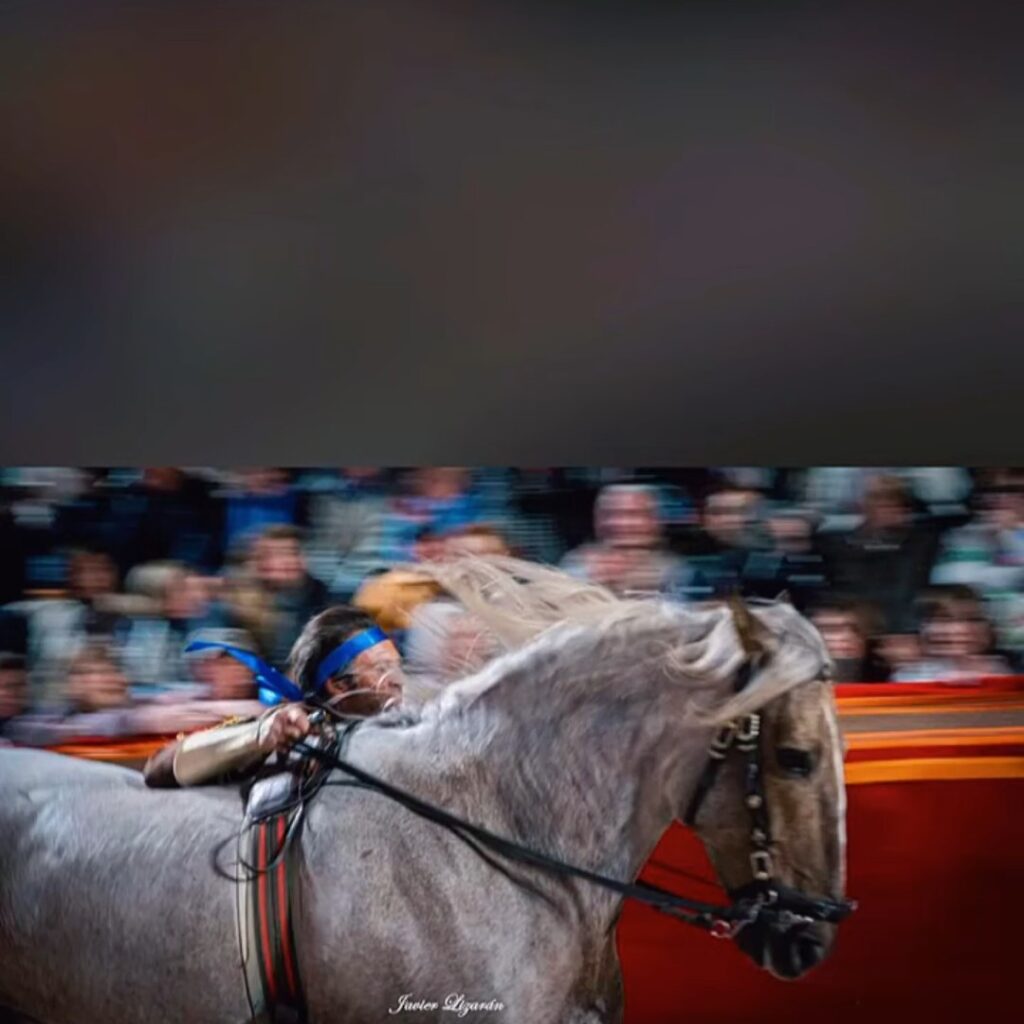 Para lograr estas piruetas en plena calle, utiliza el «cinchuelo de volteo», una pieza estrecha con dos asideros, esencial para mantener la estabilidad mientras el caballo galopa entre los vítores y el estruendo de la mítica «carrera».